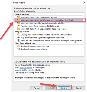 B3: Chọn Move messages with specific words in the subject to a folder (Di chuyển Email đến 1 thư mục khác dựa trên cụm từ trong Subject), sau đó nhấn Next