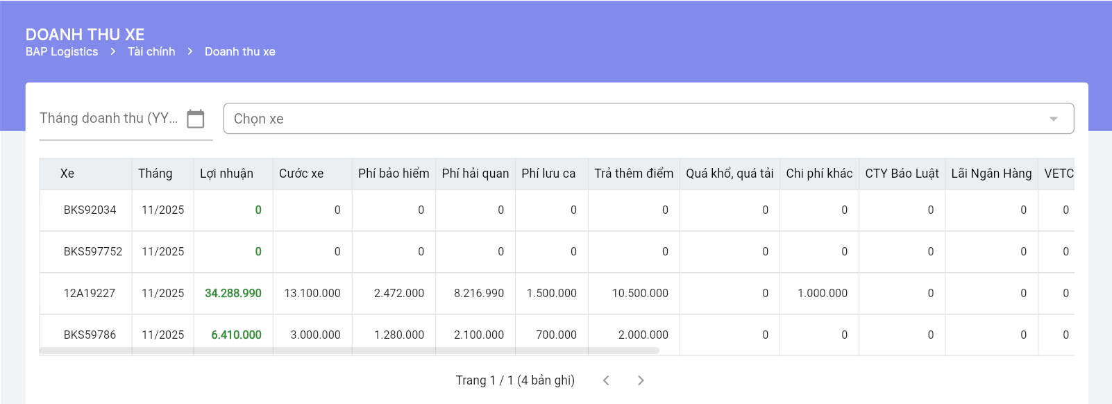 - Hiển thị lãi/lỗ tức thì: Phần mềm cho phép doanh nghiệp xem lãi/lỗ từng chuyến ngay khi tạo chuyến, giúp kiểm soát chi phí và doanh thu tức thì.